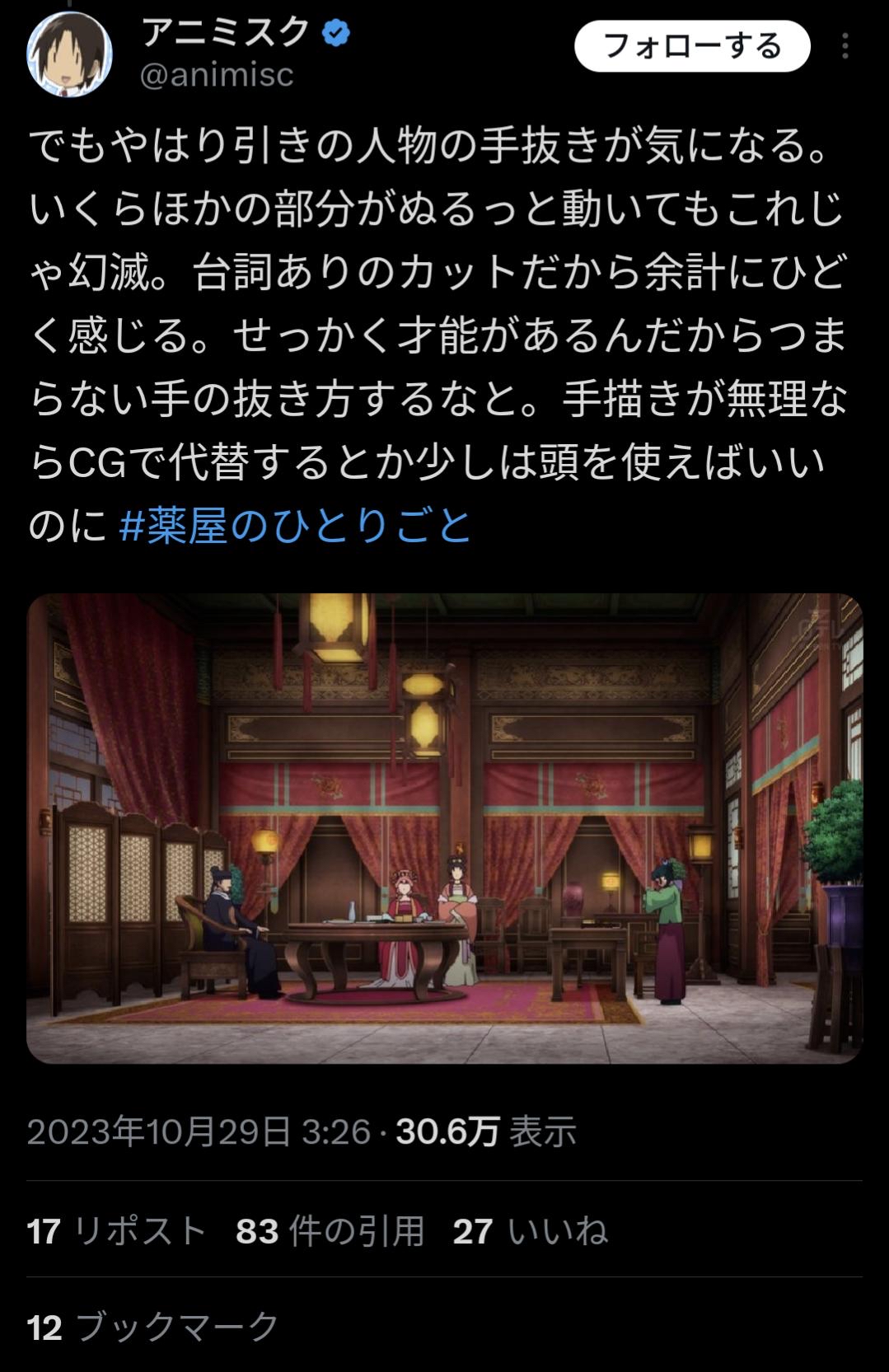 【悲報】アニメソムリエ「薬屋のひとりごとの『引きの絵』が手抜きで幻滅」→炎上wwww