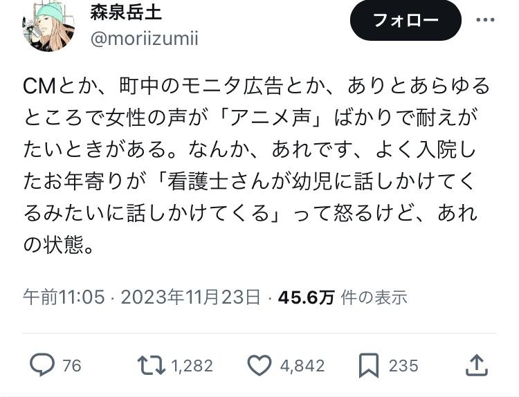 【悲報】女さん「CMや街中などあらゆるところで『アニメ声』ばかり。耐えがたい」→5000イイネへwwwww