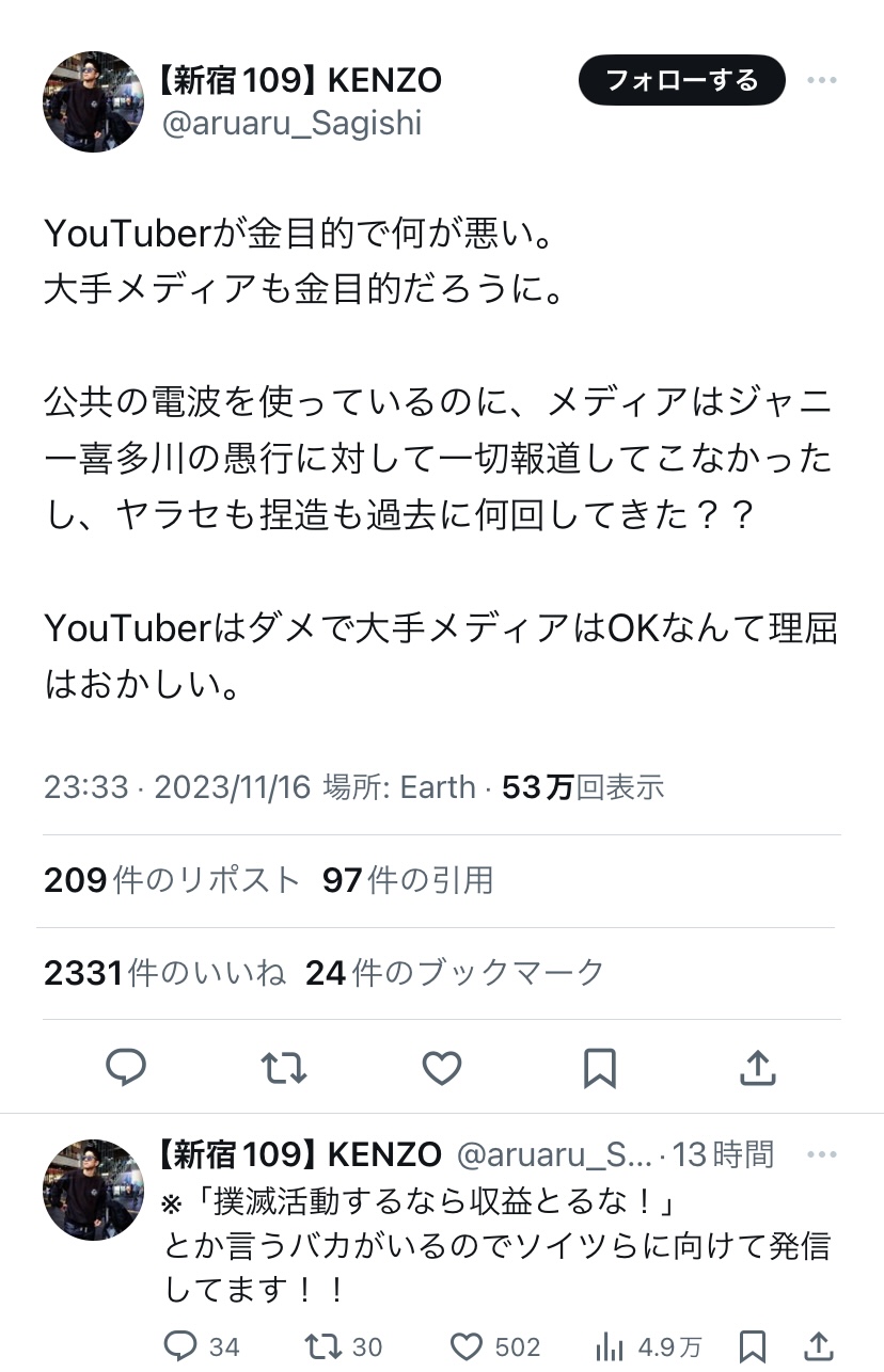 【悲報】私人逮捕系「『撲滅活動するなら収益とるな!』、とか言ってるバカどもへ。YouTuberが金目的で何が悪いの?」