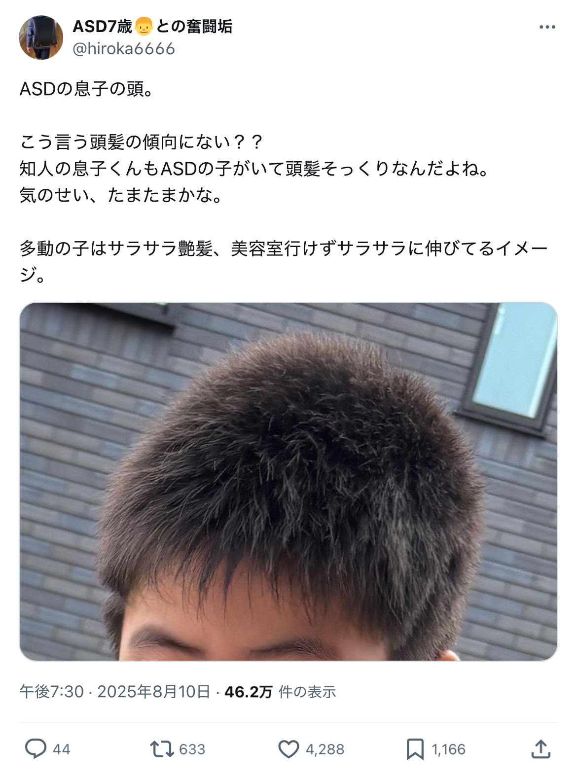【画像】ASDの子を持つ親「ASDってこういう髪質の傾向ない?(パシャ」