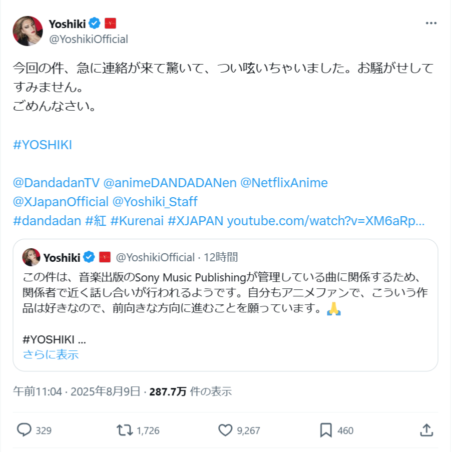 【悲報】YOSHIKI、人気アニメの「X JAPANパロディ騒動」を謝罪wwww