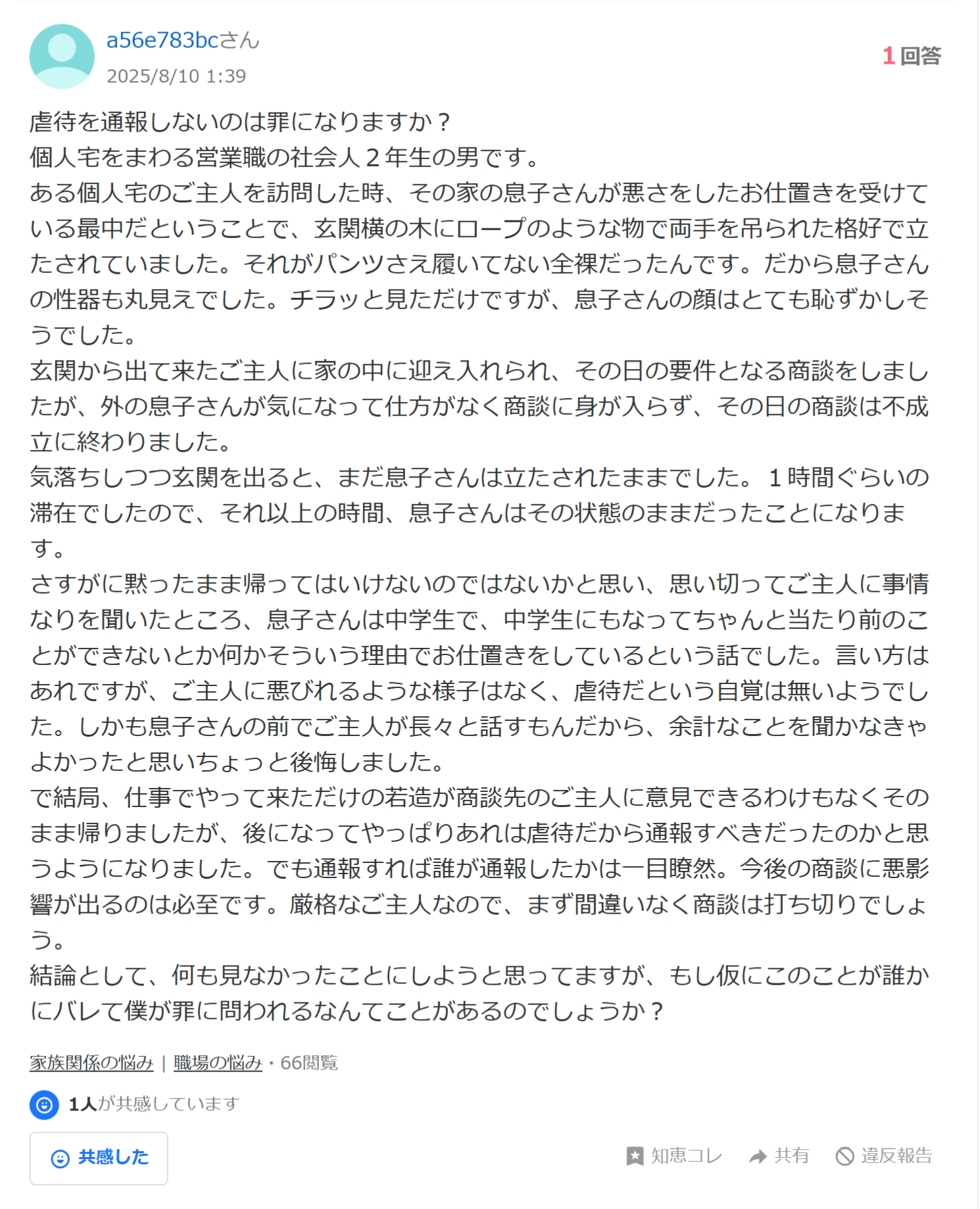 【悲報】知恵袋民「商談先の家庭で息子さんがロープで吊るされてたけど、これって通報した方がいいですか?」