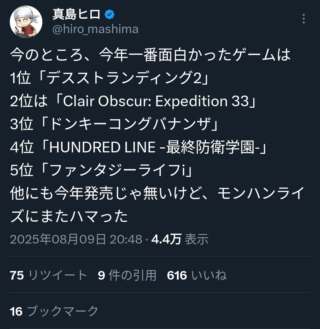 【画像】ゲーム好き大物漫画家、「今年面白かったゲーム」を発表wwww