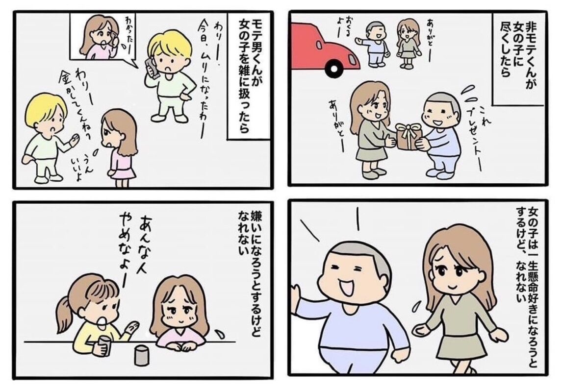 【悲報】この漫画の女さん、「非モテ」と「モテ男」に対する心境の違いを解説してしまうwwwww