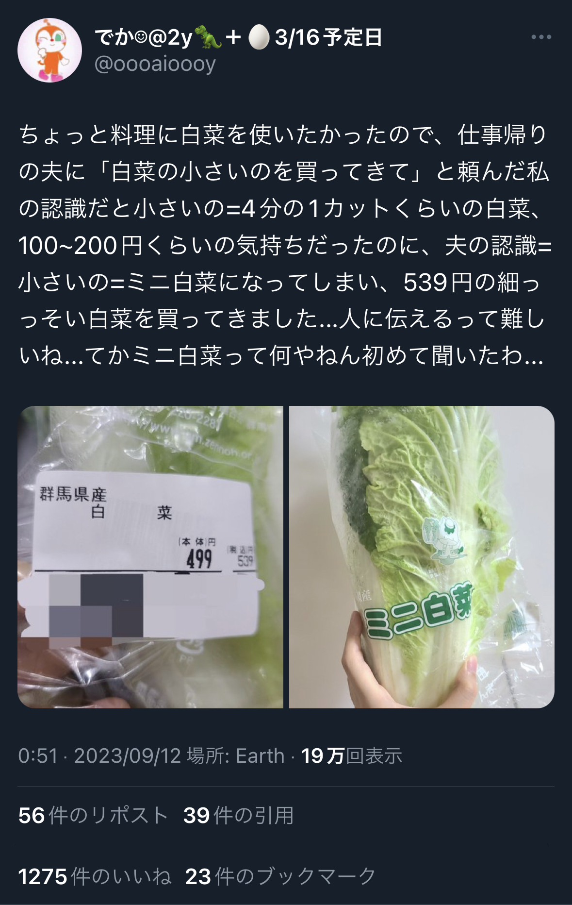 【悲報】アニメアイコン主婦「旦那に『小さい白菜買ってきて』って言ったらこれ買ってきたw」→Xで大爆笑の嵐wwww