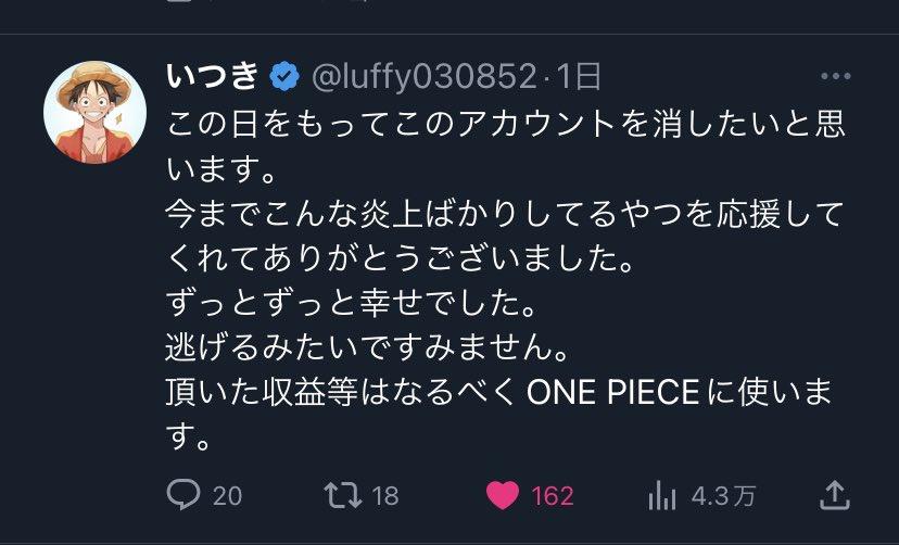 【悲報】炎上したワンピース転載系インフルエンサー、お気持ち表明してアカウント削除へwwww