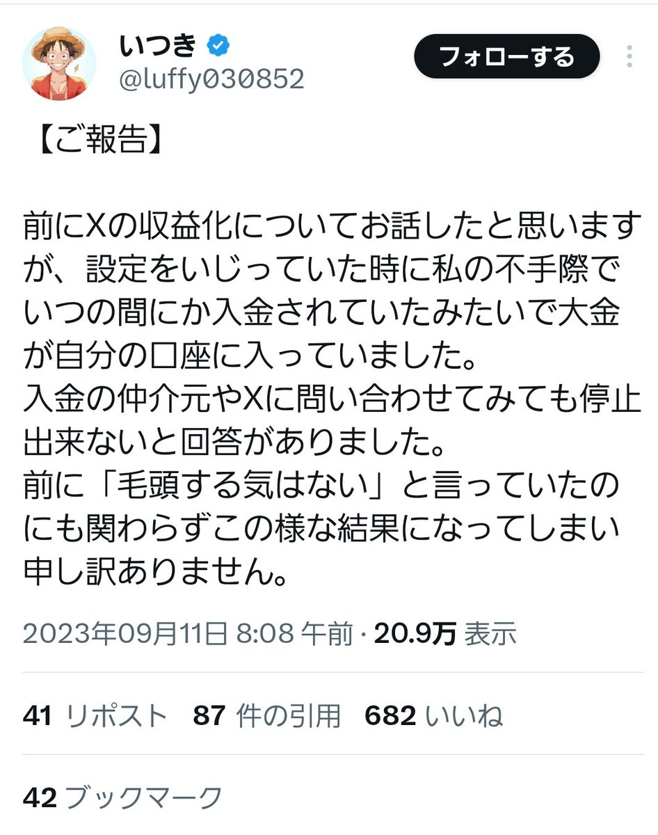 【悲報】ワンピース転載系ツイ民、『不手際』で収益化してしまい大金が振り込まれてしまうwwww