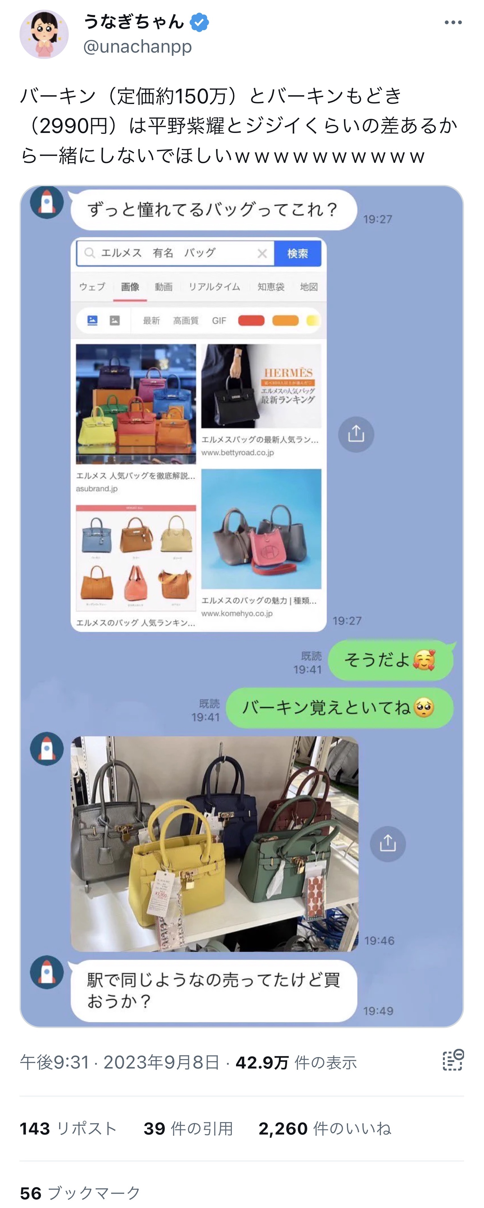 【悲報】弱男「バーキンに似たバッグが2990円で売ってる!買おうか?」→女さんドン引きへwwww
