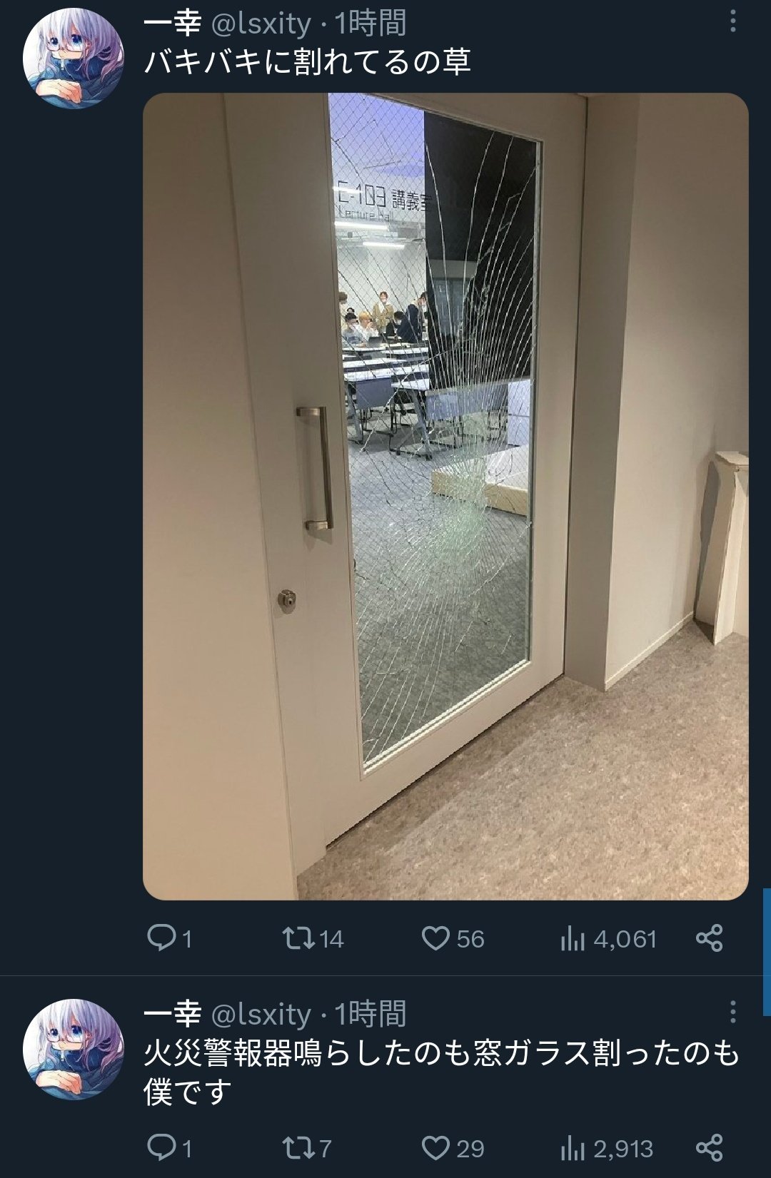 【悲報】アニメアイコン、大学のガラスドアを破壊してしまうwwwww