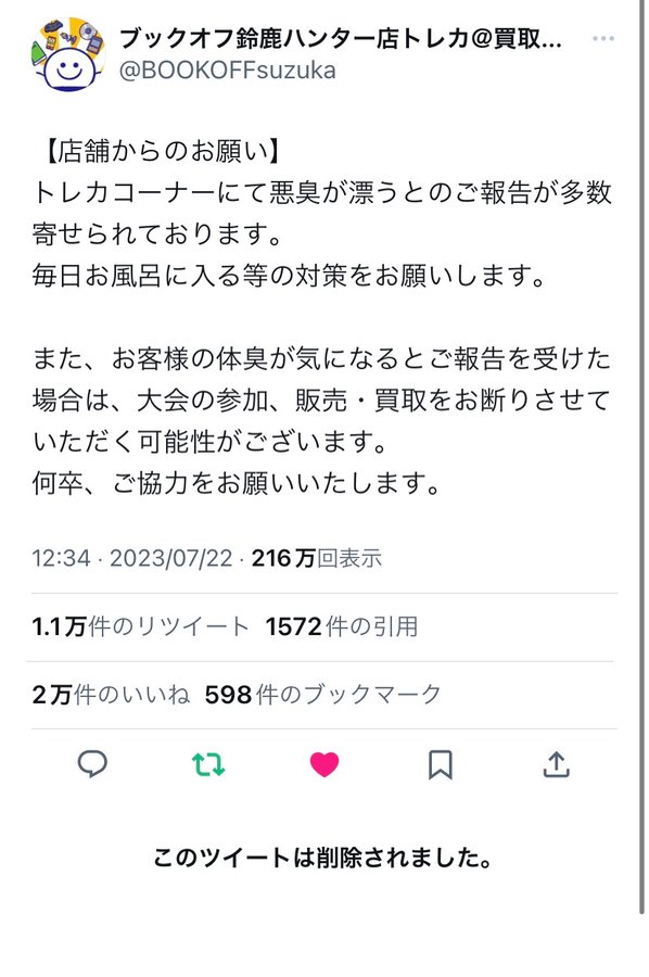 【悲報】ブックオフ「トレカコーナーに集まるみんな!頼むから風呂に入って!」→何故か謝罪する事態にwwww