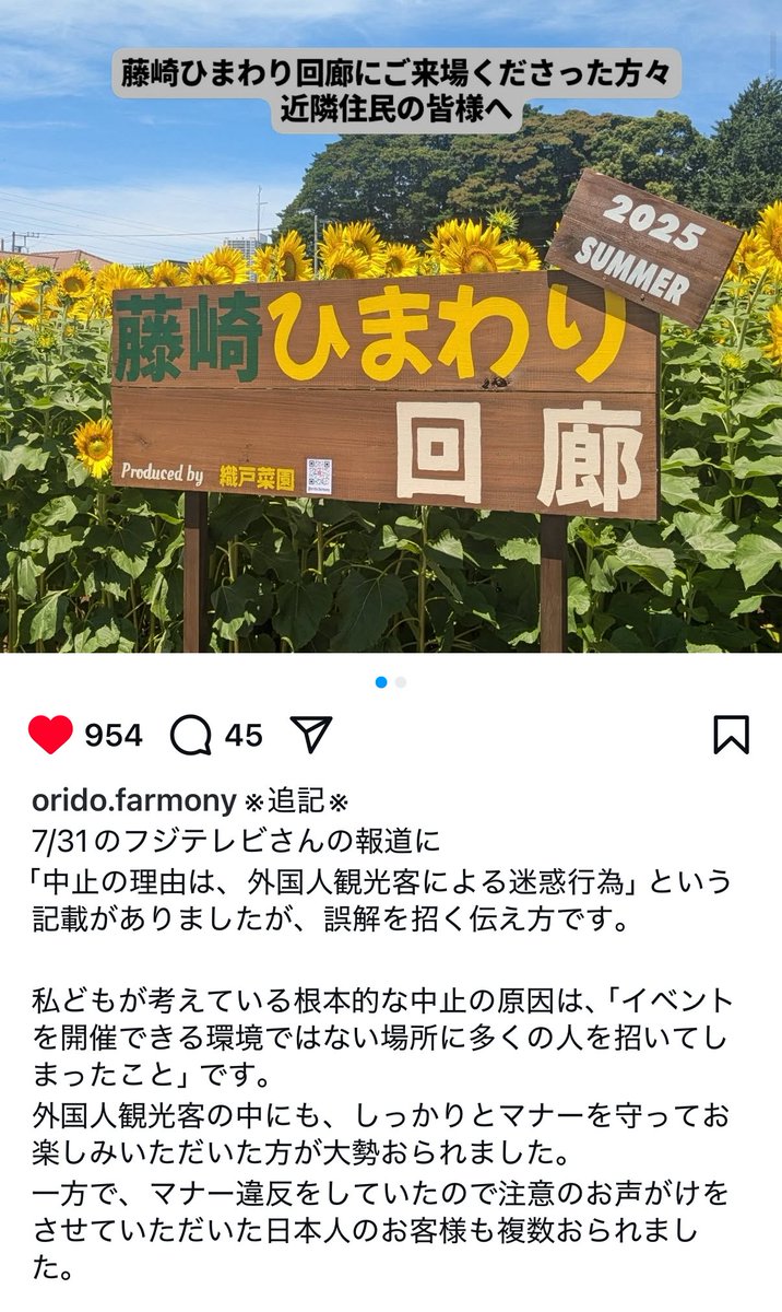 【画像】フジテレビ「嫌あぁ!迷惑外国人のせいでひまわり畑が消えたの!」主催者「外国人だけが原因なんて言ってない。日本人もマナー悪かった」