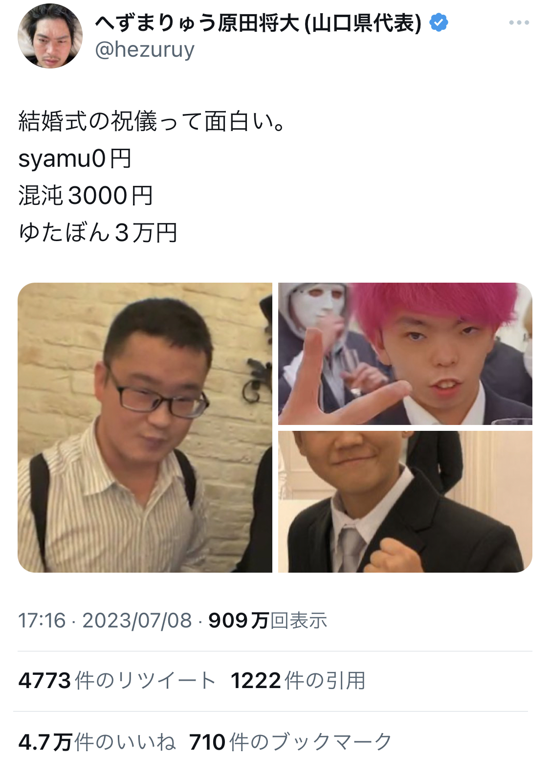 【画像】祝儀0円の男、後日へずまりゅうにご祝儀を渡すも「理由」がヤバくて草wwwww