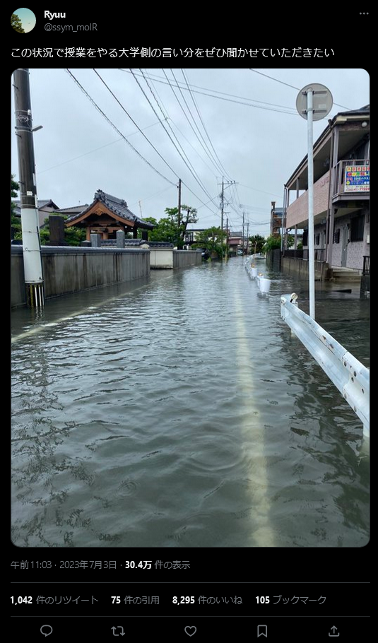 【悲報】豪雨被害の大学生「なぜ休講しないの?」パシャ←思ったより大惨事な写真が投稿されて草wwwww