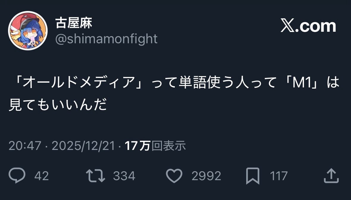 【悲報】アニメアイコン「オールドメディアって単語使う人もM1見るんだw」←ガチで効いてしまうwwwww