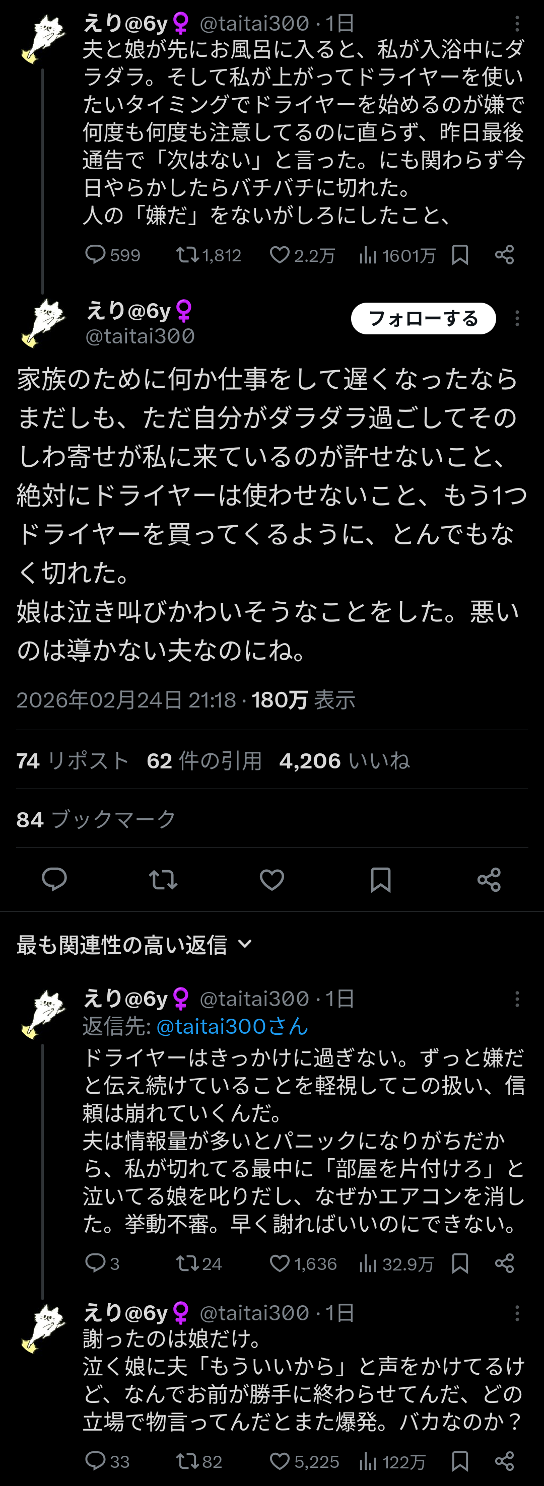 【悲報】女「ギャオオオオン!夫が風呂上がりにすぐドライヤーかけないの!ブチ切れたら娘が泣き出した!夫バカすぎん?」