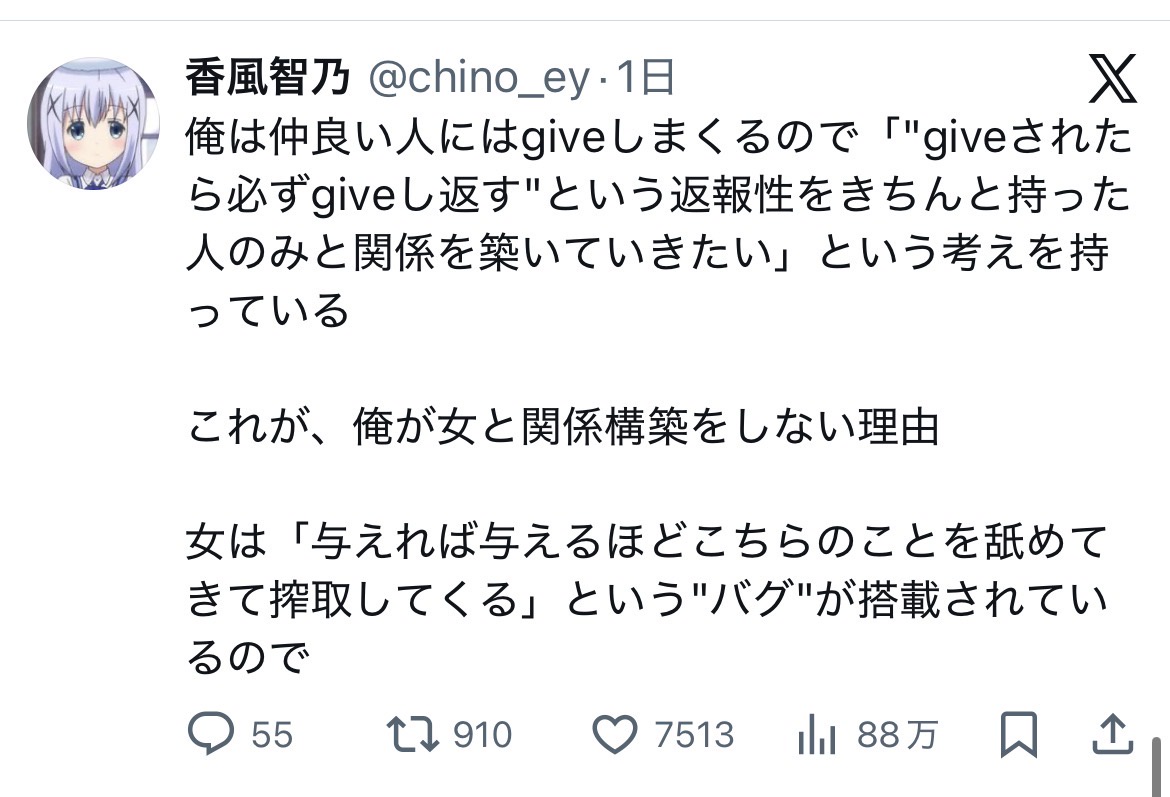 【悲報】アニメアイコン「俺が女と絶対に関係構築しない理由がこれ!」ドンッ!!