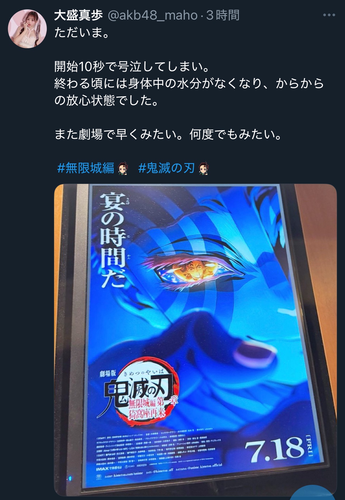 【画像】アイドル「鬼滅の映画、開始10秒で号泣した」