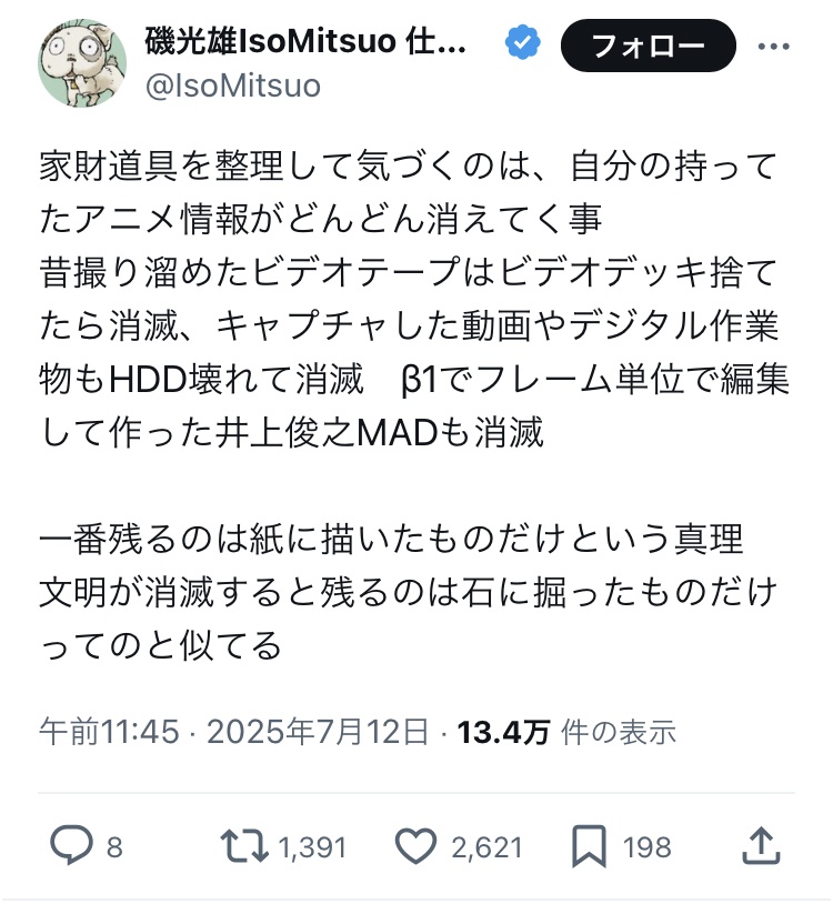 【悲報】一流アニメーター「ビデオやHDDは壊れたら消滅する。1番残るのは紙に描いたものだけ」