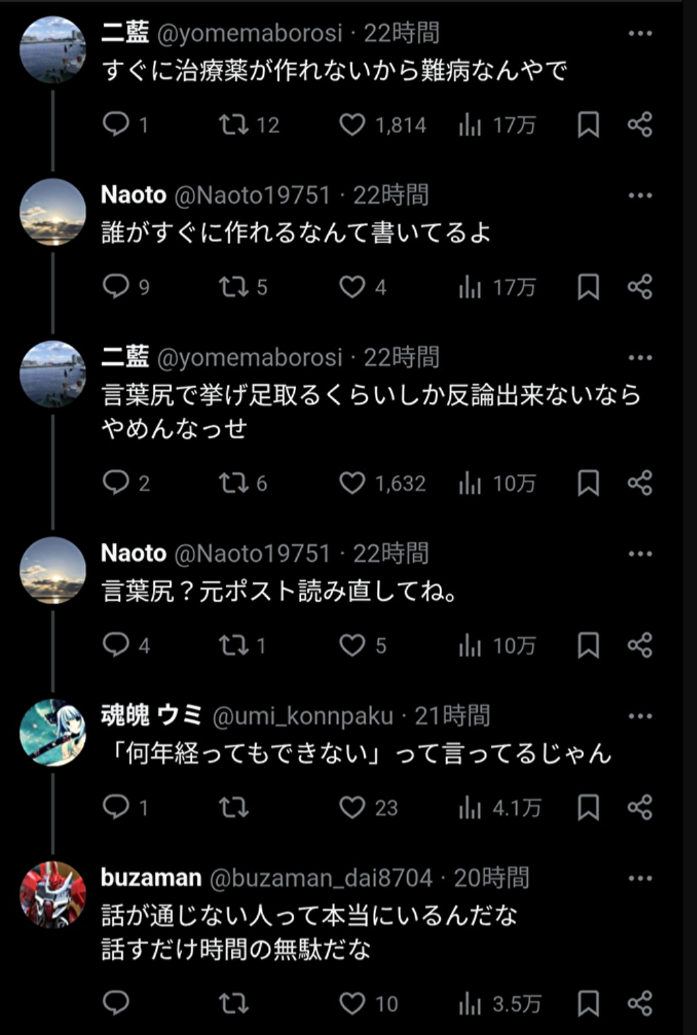【悲報】X「なんで難病と言われる治療薬は何年経ってもできないの?」←何も言い返せんかったわ…