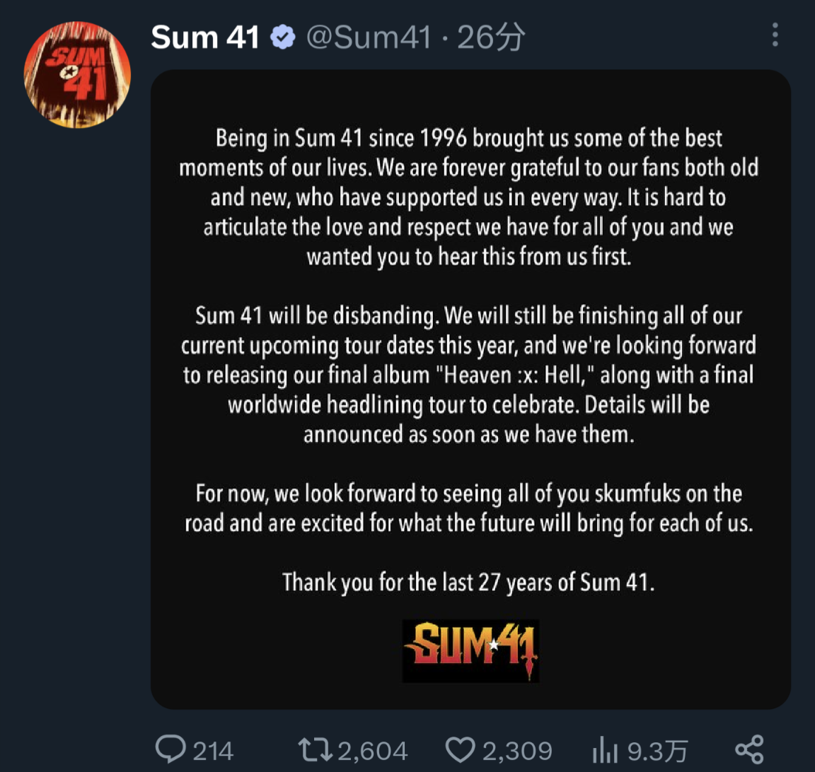 【悲報】洋楽オタク御用達バンド「sum41」、解散してしまう…