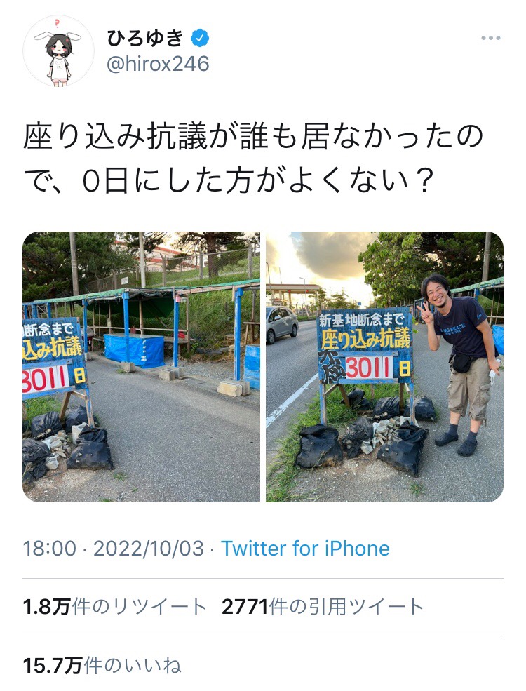 【画像】論破王ひろゆき、沖縄の『座り込み抗議』を茶化して自治体にブチギレられてしまうwwwww