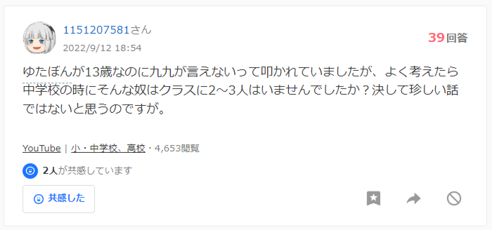 【悲報】アニメアイコン、気付く「ゆたぼん叩かれてるけど『九九が言えない人』ってクラスに数人いたよね」