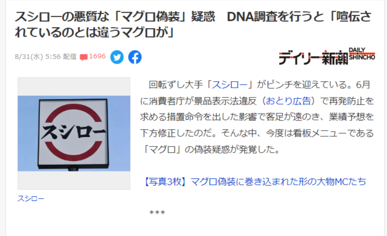【悲報】炎上続きのスシロー、マグロ偽装疑惑に言及「すまん、担当者が誤った認識のままでいたわw」←ヤバくね?