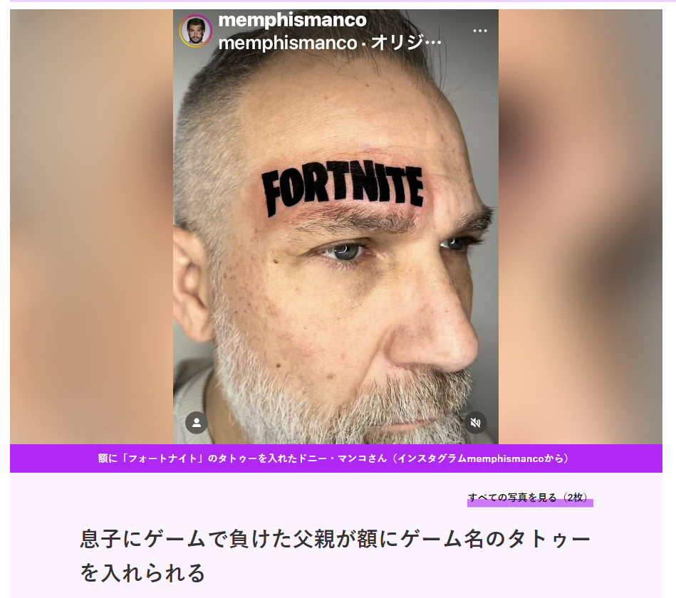 【悲報】息子にゲームで負けたパパ、額にゲーム名のタトゥーを入れられるwwwww