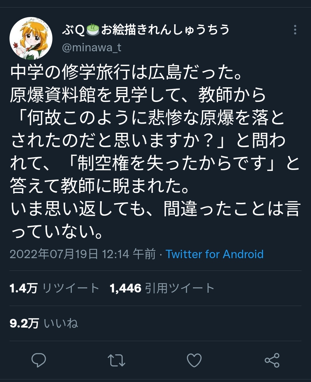 【悲報】教師「なぜ日本は原爆投下されたの?」アニメアイコン「制空権を失ったからです」ニチャア