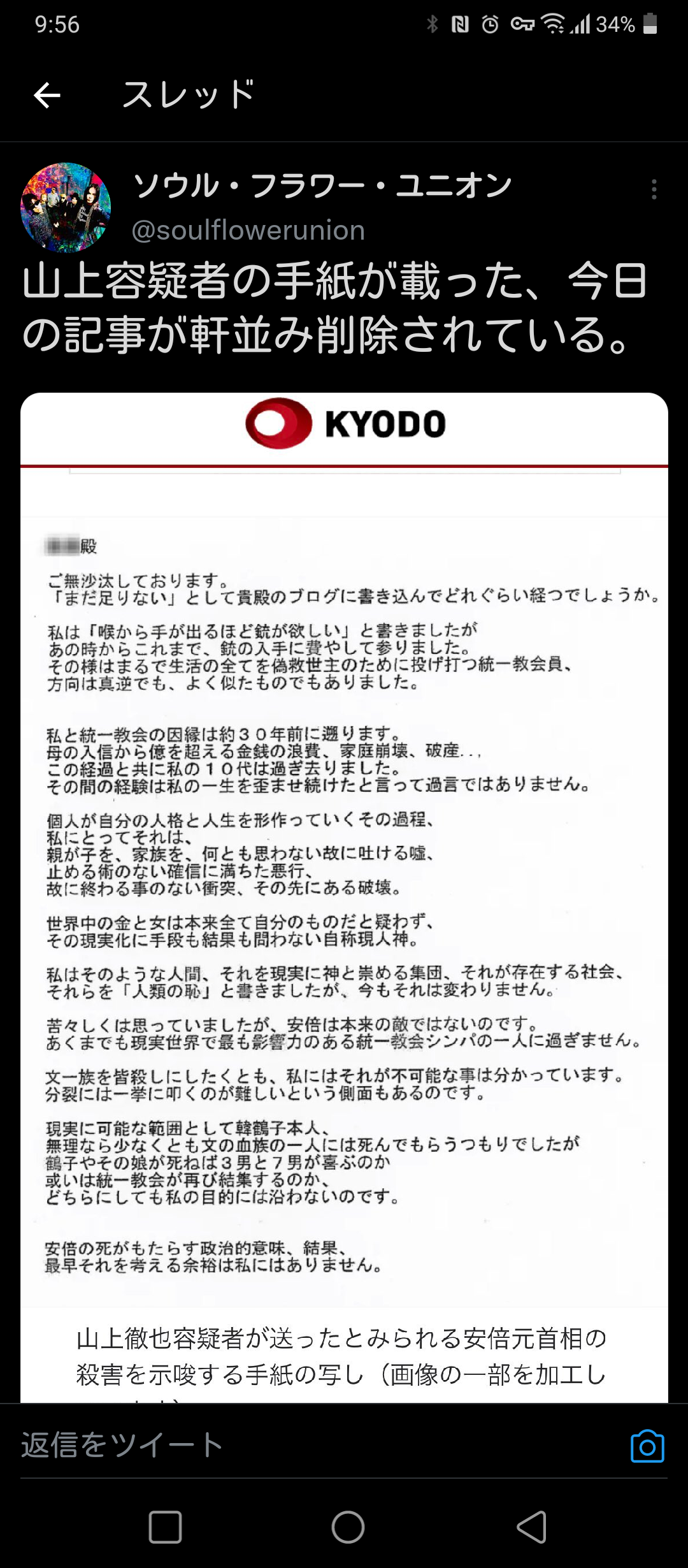 【悲報】山上銃撃犯の声明文、『謎の圧力』でネット上から削除されまくる。一体何が起こっているんです?