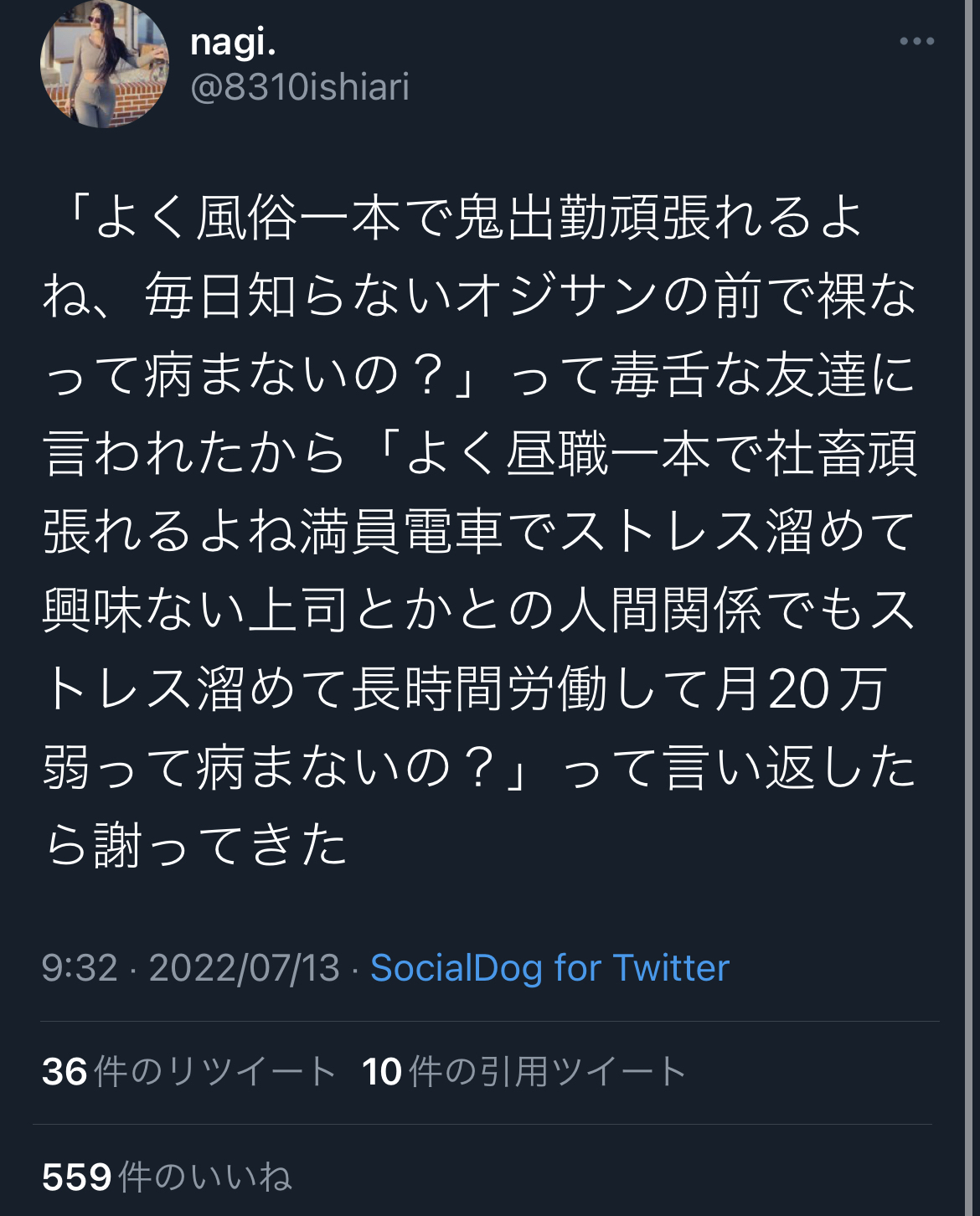 【悲報】夜職女さん、『昼職』の友人を論破する「よく昼職一本で社畜頑張れるね、病まないの?」