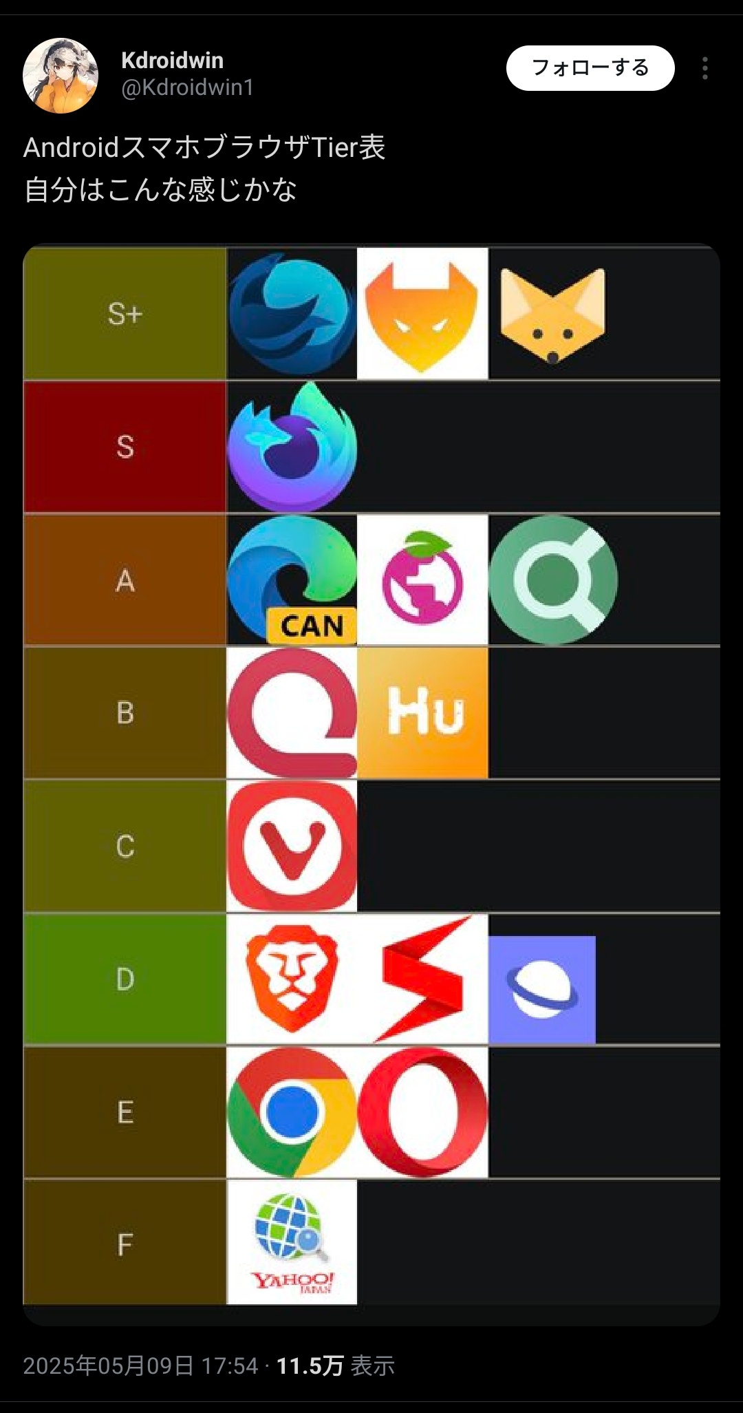 【画像】AndroidスマホブラウザTier、発表されるwwww