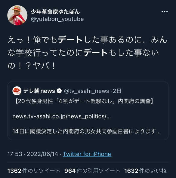 【悲報】ゆたぼん、デート経験なしの弱者男性を煽る「えっ!俺でもデートした事あるのにお前ら無いの?ヤバ!」