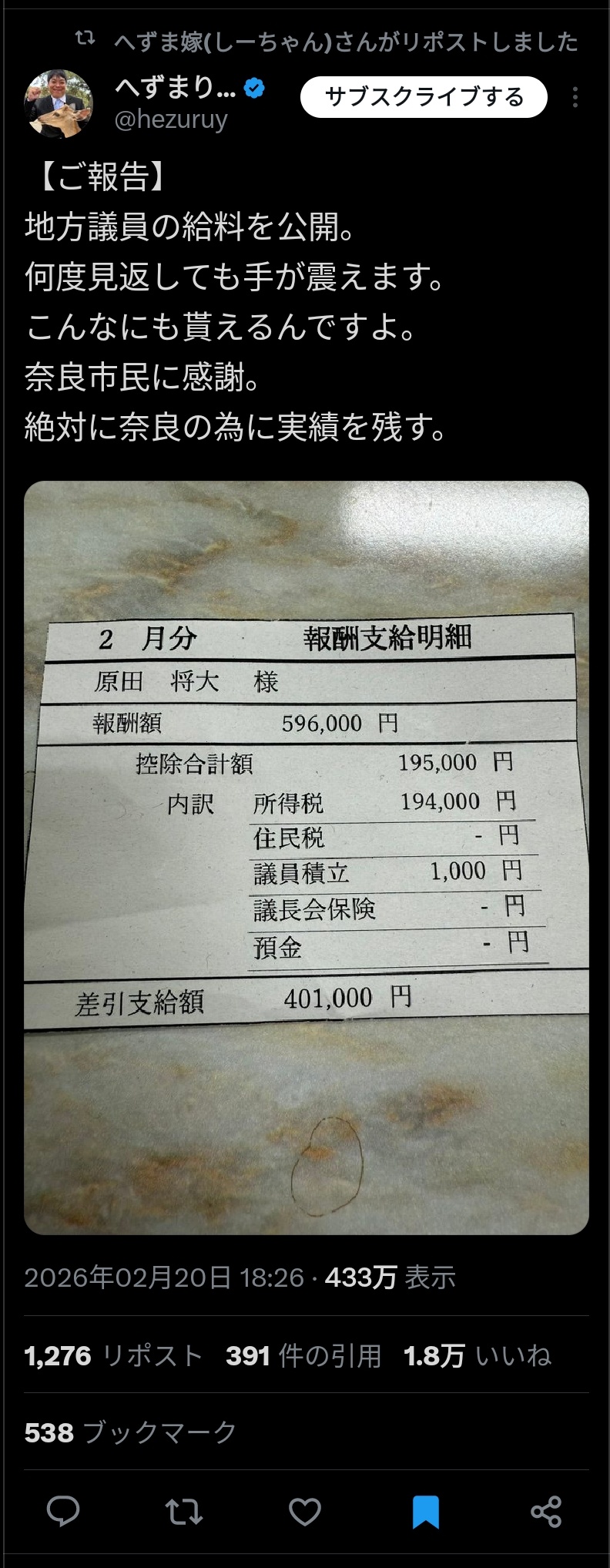 【画像】元迷惑系YouTuber議員、給料を公開「何度見返しても手が震えます」