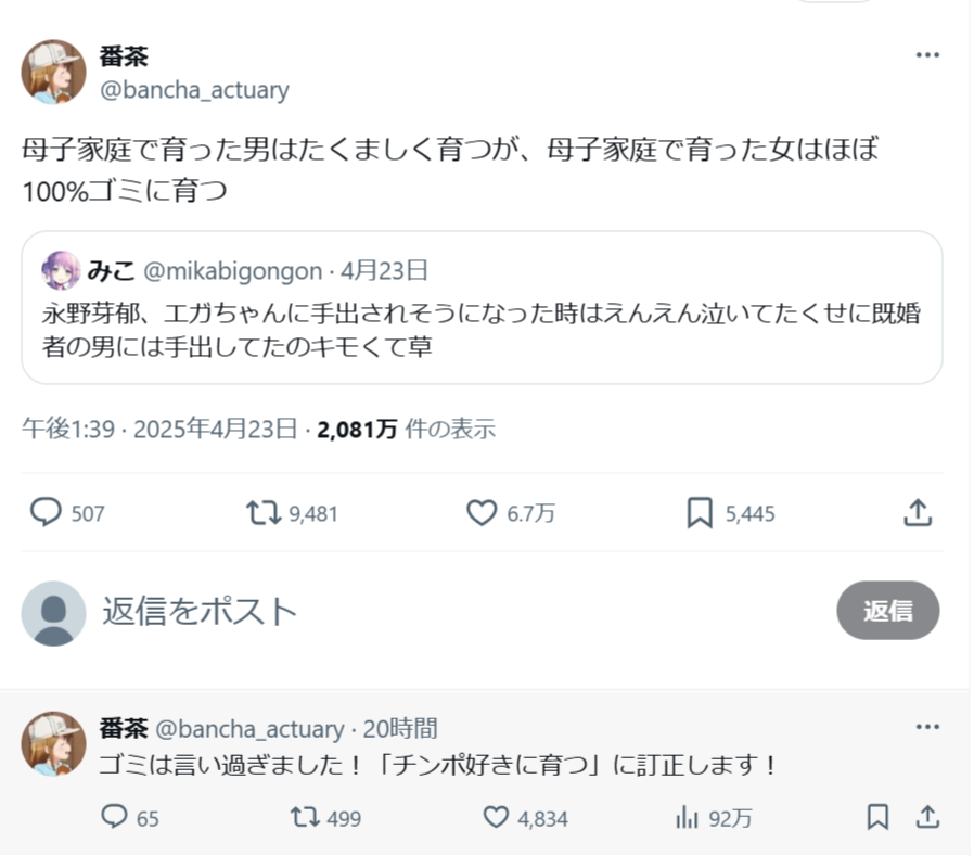 【悲報】アニメアイコンさん、偏見が酷すぎる「母子家庭で育った男はたくましく育つが、母子家庭で育った女はほぼ100%ゴミに育つ」