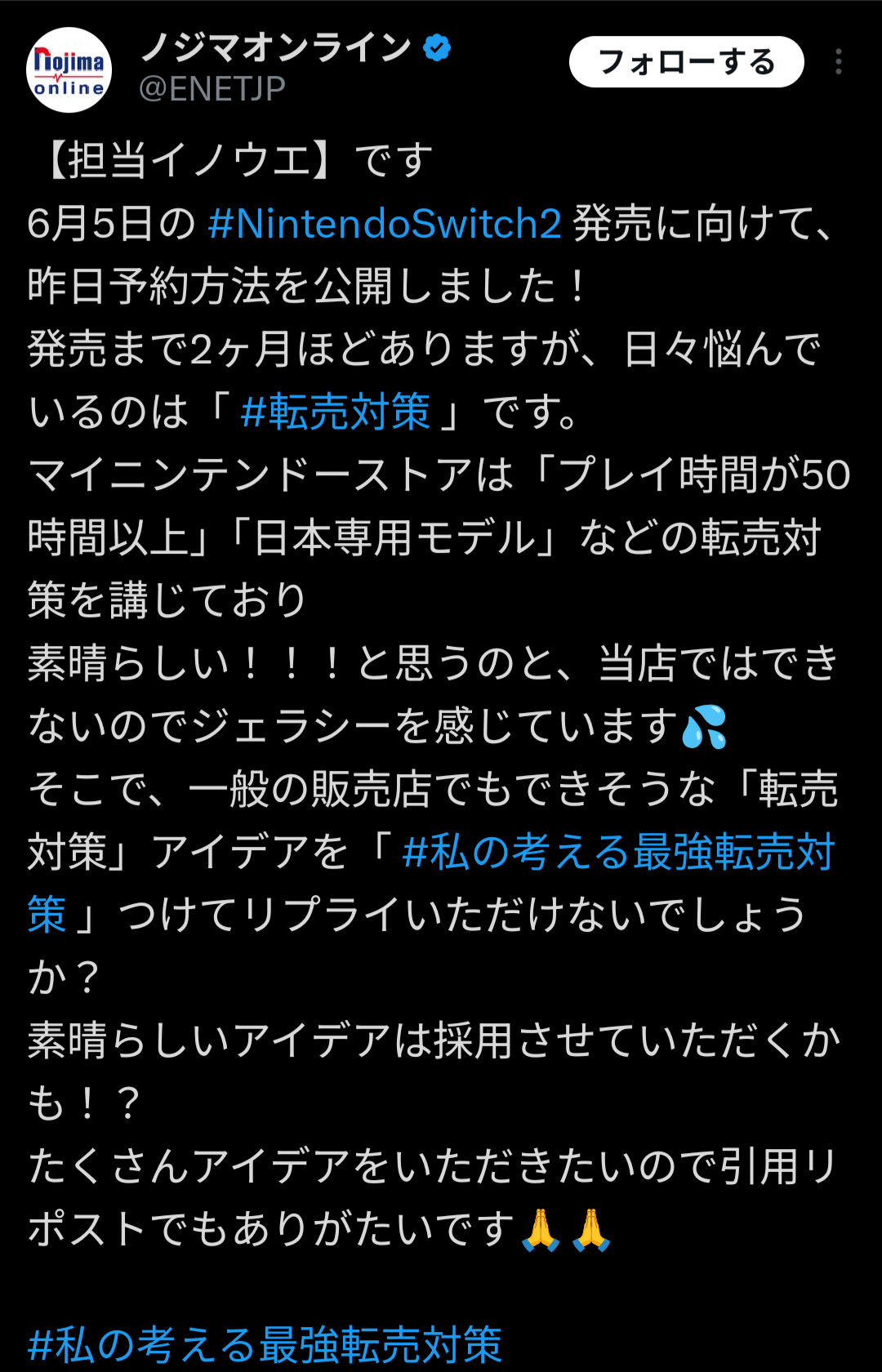 【画像】ノジマ「Switch2の転売対策を教えてください!」