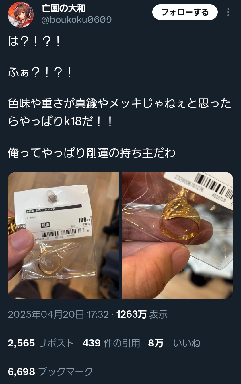 【画像】アニメアイコン「中古屋で『18金の指輪』が100円で売られてた!」(パシャッ