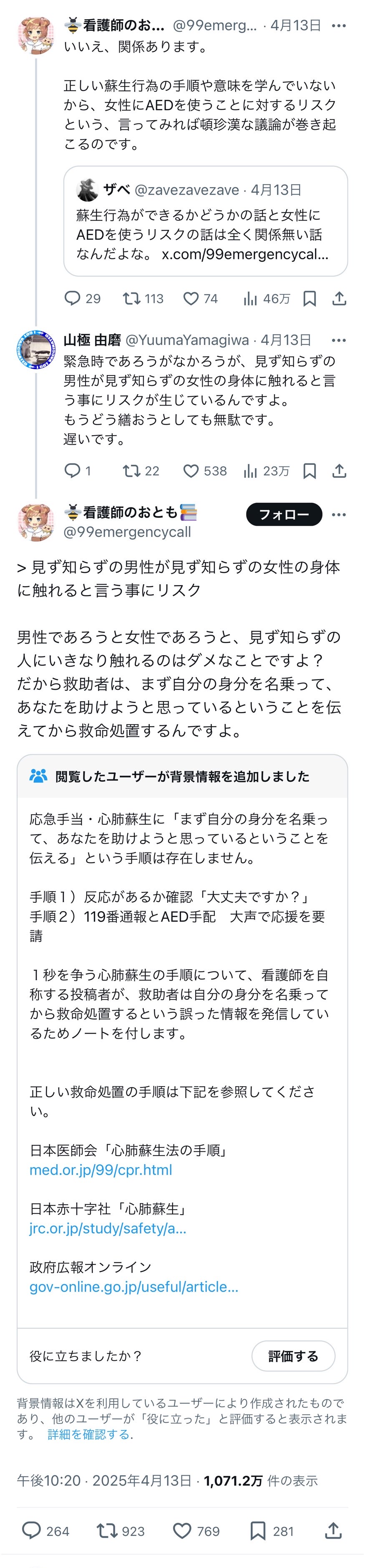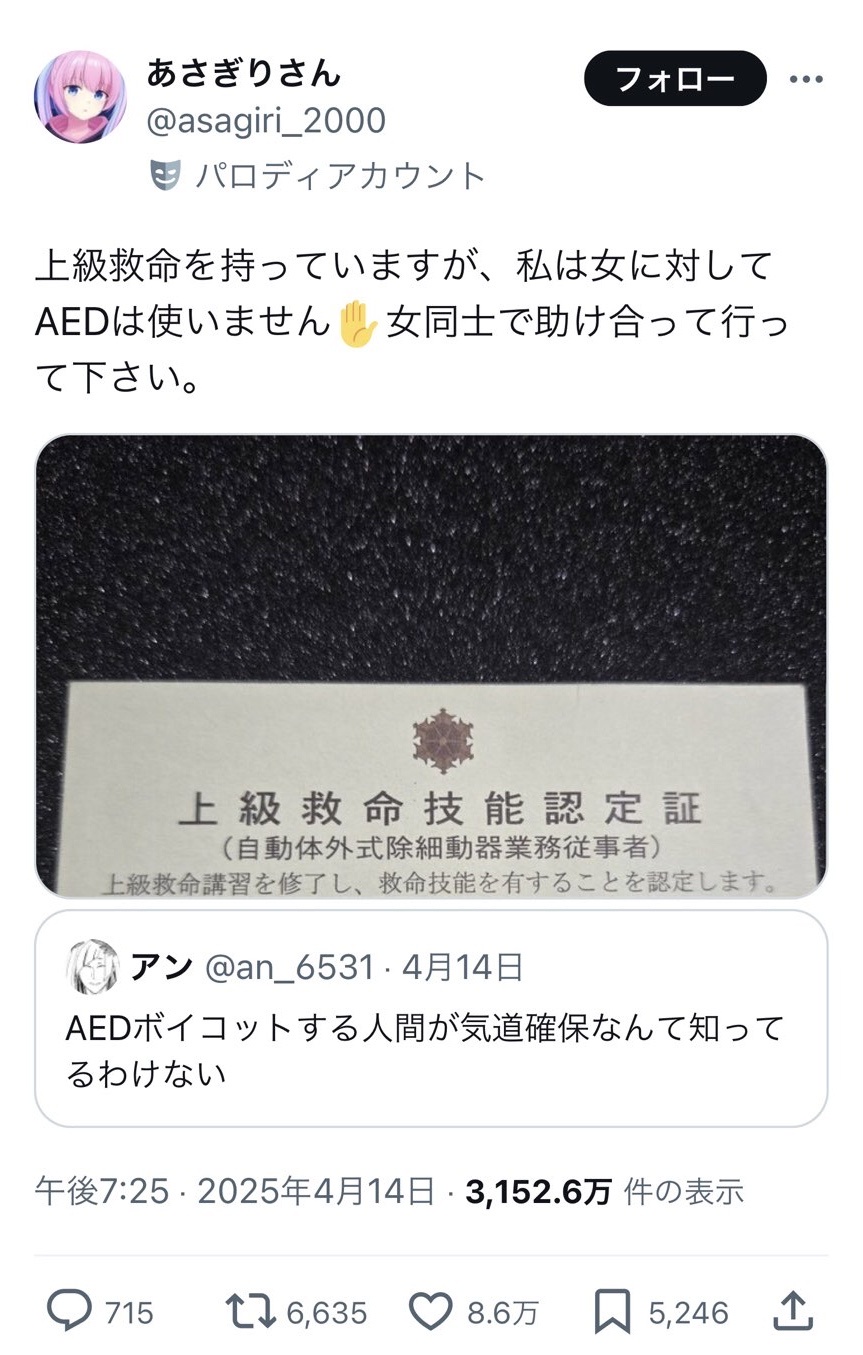 【悲報】アニメアイコン上級救命士「私は女に対してはAEDを使いません」8.6万いいね