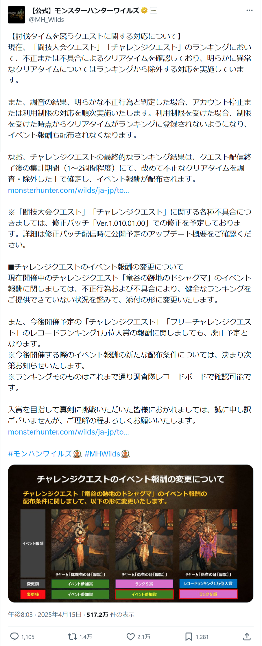 【悲報】モンハンのイベント、チーターが多すぎて運営がお気持ち表明wwww